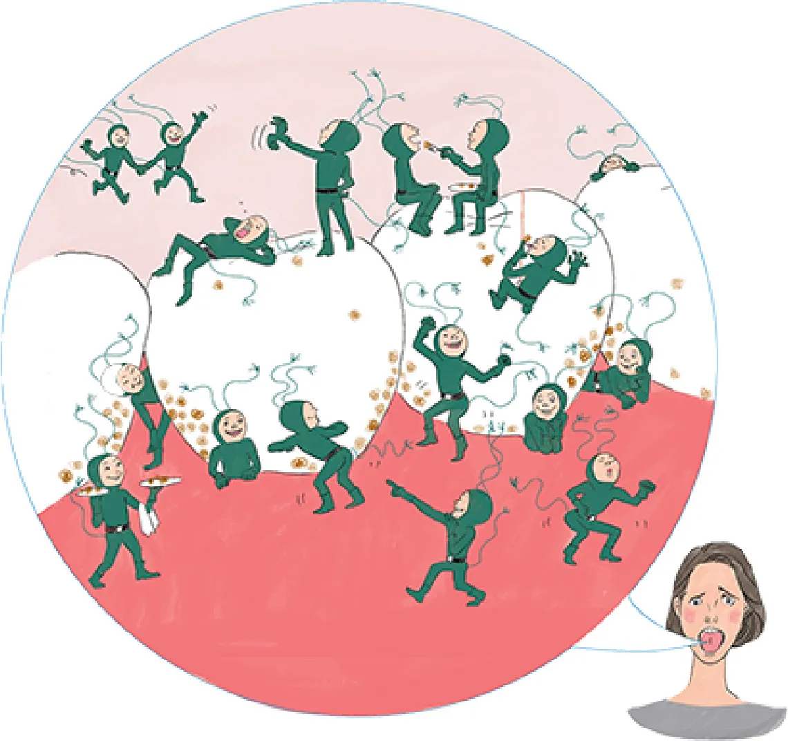 体の中にいる警備員のような存在「免疫細胞」が活発に動き出し、歯周病菌とバトル。