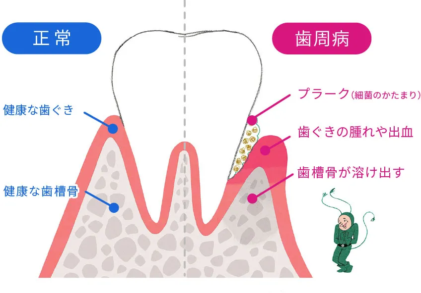 歯の周りにある歯ぐき(歯肉)に炎症が起こり、さらに病気が進行すると歯を支えている骨(歯槽骨※しそうこつ)が溶けてしまいます。